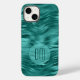 On this phone case, your double digit monogram in dark teal is placed on a semi transparent lighter teal blue circle banner. The banner is on a pretty background of faux teal foil abstract waves. Shimmery, and sure to be noticed.