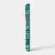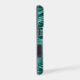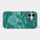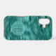 On this phone case, your double digit monogram in dark teal is placed on a semi transparent lighter teal blue circle banner. The banner is on a pretty background of faux teal foil abstract waves. Shimmery, and sure to be noticed.
