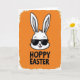 Designed with a stylish, human-like rabbit centered on a bright orange background, this card keeps the focus on its fluffy white face and long ears. Soft gray shading fills the inner ears, and a tiny pink nose sits above a gentle smile that feels like a friendly wink to someone special 🐰. Dark, reflective sunglasses cover its eyes, adding a cool, slightly mysterious look that can read like quiet confidence or a flirty tease. The orange backdrop isn’t flat; it has a brushed, slightly worn edge that frames the scene like paint along the borders. Near the bottom, the greeting “HOPPY EASTER” is set in thick black letters, lined up neatly beneath the rabbit. The strong contrast between white fur, black shades and lettering, and the orange field makes the design pop while still feeling easy to look at 🌷. The border shows uneven, textured orange strokes that fade and roughen toward the edges.
