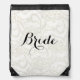 Carry your stuff in style with the pretty FAUX White Lace Wedding Bridal Drawstring Backpack. This cute and custom light weight nylon backpack features a photograph of intricate white lace. Customize it with the personal name of the bride to be, bridesmaids or bridal attendants or text of your choice. Perfect for carrying a wedding emergency kit, shoes or wedding day supplies. It makes a unique gift idea for an engagement party or bridal shower.