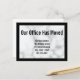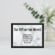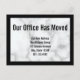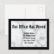 Display text says ' Our office has moved'. Customize your postcard with your company's name, new address, and phone number. The background is has a white marble look. The postcard has a black border.