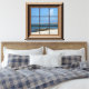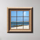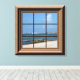 Features a faux wood framed window overlooking a beach in Mexico. The frame continues around the sides of the canvas. View additional images for a closer look.