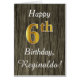This simple birthday card design features the message "Happy 6th Birthday", with the "6th" having a faux gold-like appearance. It also features a personalized name, and a faux wood appearance background. It could be given to somebody who is celebrating their sixth birthday.