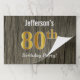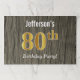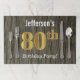This simple, customizable birthday party placemat design features a message like "Jefferson’s 80th Birthday Party!", with the name being customizable, and with the "80th" having a faux gold-like appearance. It also features a faux wood appearance background. It could be used at a party for somebody who is celebrating their eightieth birthday. [~Z0000073]