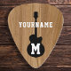 To add a touch of personality, we've integrated a cool University and sportive font style to display your name, making this guitar pick not only a functional accessory but also a statement of your musical identity. The combination of the rustic wood background, bold black guitar illustration, and personalized details creates a harmonious blend of tradition and modernity, offering a timeless aesthetic for musicians who appreciate both classic and contemporary elements.