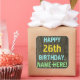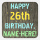 This fun birthday-themed sticker design features a message like "HAPPY 26th BIRTHDAY, NAME-HERE!", where the name can be personalized. The background features a rustic, brown, faux wood grain appearance pattern. The personalized message text features colors like blue, yellow, and green, and it has an appearance inspired by that of painted, stenciled lettering. Stickers like these could perhaps be given as a gift, or perhaps be used as decorations at a birthday party being held for somebody who is celebrating their twenty sixth birthday. [~Z0000296]