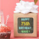 This fun birthday-themed sticker design features a message like "HAPPY 75th BIRTHDAY, <NAME>!", where the name can be personalized. The background features a rustic, brown, faux wood grain appearance pattern. The personalized message text features colors like blue, yellow, and green, and it has an appearance inspired by that of painted, stenciled lettering. Stickers like these could perhaps be given as a gift, or perhaps be used as decorations at a birthday party being held for somebody who is celebrating their seventy fifth birthday. [~Z0000296]
