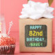 This fun birthday-themed sticker design features a message like "HAPPY 82nd BIRTHDAY, <NAME>!", where the name can be personalized. The background features a rustic, brown, faux wood grain appearance pattern. The customizable message text features colors like blue, yellow, and green, and it has an appearance inspired by that of painted, stenciled lettering. Stickers like these could perhaps be given as a gift, or perhaps be used as decorations at a birthday party being held for somebody who is celebrating their eighty second birthday. [~Z0000296]