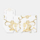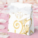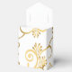 Shown is a tent style favor box in White with a fancy Golden-color printed heart pattern on it and floral-type print all over box. Embellished with a White ribbon at top. Newlyweds names on each side of heart and the last name inside the heart. Customize this item or buy as shown.