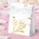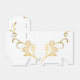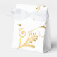 Shown is a tent style favor box in White with a fancy gold floral printed pattern on it. Embellished with a White ribbon at top. Customize this item or buy as shown.