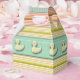 Layers of grosgrain and gingham ribbons and twisted satin cord run above and below a charming line of little "ducks in a row" . . . headed in either direction. The soft yellows, oranges and greens make this design a natural for babies and baby showers. As a favor box, you can fill it with candies or other confections or prizes for the guests of your baby shower. As a gift box, it's just big enough to fit the matching pacifier, also available in this collection, or a charming color-coordinated newborn hat or booties.