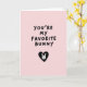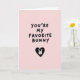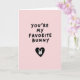 This card features a soft blush pink background with a sweet, affectionate tone that feels like a quiet inside joke between close friends or partners 🌷. Across the upper center, the message “YOU’RE MY FAVORITE BUNNY” is written in thick, rounded black lettering arranged over three lines, giving it a cozy, informal look. The words sit evenly spaced, with the phrase taking up most of the top half so your eyes land on it right away. Just below the text, a solid black heart anchors the design like a little promise at the bottom of the note. Inside the heart, a small white rabbit head appears with two upright ears, dot eyes, and a tiny triangle nose, as if it’s gazing up at the message with gentle devotion 🐰. The strong contrast of black and white against the pink background keeps the layout simple while still feeling intimate and close. The heart and bunny icon are centered beneath the lettering, with clean edges and plenty of pink space around them. The bunny’s face is minimal, with two dots for eyes and a small inverted triangle nose inside the white head shape.