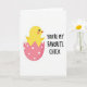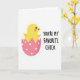 This card shows a small golden-yellow chick on the left, peeking out of a rosy pink eggshell with a jagged edge, set against a white background 🌷. The shell is dotted with small white circles, giving it a sweet, gift-wrap look. The chick has round black eyes, a tiny orange beak, and a soft blush on one cheek, like it’s sharing a shy, affectionate glance with someone just off to the right 🐰. Its little wings lift slightly, suggesting a gentle, just-woke-up stretch that feels tender and friendly. On the right side, the message “YOU’RE MY FAVORITE CHICK” appears in uppercase letters, stacked in neat lines for easy reading. The lettering is dark and stands out strongly against the white space, balancing the chick and shell on the opposite side. The overall layout feels airy, with the chick and shell occupying the left third while the text fills the right, and the pink shell’s white dots repeat evenly across its surface.