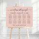 Chic blush pink wedding seating chart foam board sign for up to 10 tables that features "our favorite people" in an elegant script with swashes, your names and wedding date joined together by a heart and "We're so glad you're here" in simple modern lettering.