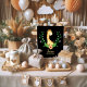 Favors sign for your guests for your baby shower featuring a cute, watercolor, giraffe, smiling and sitting above a tropical floral wreath adorned with a yellow hibiscus and greenery. "Favors" light yellow text on black background under giraffe.