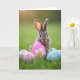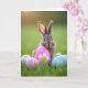 Designed with a close-up view of a small fawn-colored bunny, this card centers on its mottled fur, big dark eyes, and fine whiskers for a sweet, friendly connection 🐰. Warm sunlight from behind turns the edges of its upright ears a soft amber, creating a gentle halo around its head. The bunny sits low in a bed of emerald grass, with the foreground and background softly blurred so your attention stays on its tender expression. Nestled against its chest is a pink egg with small white and yellow flowers, posed as if the bunny is carefully holding it for someone special 🌷. Nearby, a few more eggs in pale blue, light pink, and white peek through the grass, each decorated with simple floral patterns that echo the spring setting. A short Easter greeting appears near the top in light pastel lettering, with a smaller line of text placed near the bottom in a matching soft tone. The scene is framed by green blades of grass and scattered pastel eggs, with the sunlit ears glowing at the center.