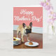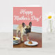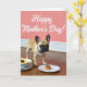 This card shows a vertical scene where a small fawn-colored dog with upright ears and a wrinkled dark snout sits on a shiny wooden floor, looking forward with wide eyes that feel like a tender request for attention ❤️. A simple dark collar with a subtle pattern rests around its neck, adding a neat touch without stealing focus. Behind the dog, a coral-pink wall sets a cozy backdrop, and near the top the message “Happy Mother’s Day!” appears in white lettering, centered above the dog. Soft lighting brings out the texture of the fur and the gentle sheen of the floor, like a quiet moment right before a shared meal. On the left side, a tidy stack of white plates is topped with a folded yellow napkin holding a small dark red item, suggesting someone set things out with care 🌼. On the right, a single white plate holds a golden-brown baked treat, placed as if it’s being offered while the dog watches closely. The floorboards run lengthwise beneath the dog, reflecting faint highlights along the edges of the plates.