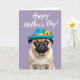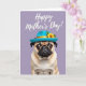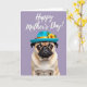 This card features a short-snouted little dog centered on the front, with fawn-colored fur and wide-set dark eyes that feel tender and attentive, like it’s looking up at someone it trusts ❤️. It wears a teal-blue fedora-style hat tipped slightly to one side, adding a friendly, affectionate mood to the portrait. An orange ribbon wraps around the hat, and a yellow daisy-like flower with green leaves sits on the band, bringing a gentle garden touch 🌼. The background is a smooth, even lavender-purple field that keeps the focus on the dog’s face and hat. Near the top, the message “Happy Mother’s Day!” is written in flowing white lettering, arcing lightly above the dog’s head. Soft, even lighting highlights the fur texture, the folds around the muzzle, and the fabric of the hat without harsh shadows. The dog’s slightly tilted head and calm expression suggest closeness, like a quiet moment shared between friends or family. The flower’s petals are bright yellow with a warm center, and the leaves show small veins against the teal hatband.