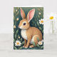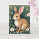 This design shows a fawn‑colored bunny 🐰 resting in the lower half of the scene, angled slightly left as if pausing to meet someone’s gaze with a tender, trusting look. Warm ochre fur is set off by a bright white chest and soft pink inside its tall ears, while deep burgundy eyes catch tiny white highlights that feel like a quiet shared moment. Surrounding it is a garden-like frame of emerald leaves and slim stems, arranged like layered cut shapes against a cool teal‑green background. Small white daisy flowers with yellow‑orange centers dot the foliage, along with creamy buds that look ready to open, adding gentle contrast. Near the top, simple Easter wording sits centered in a light cream tone, with a smaller line beneath it in soft pink for a sweet, friendly touch 🐇. The lighting stays soft and even, bringing out velvety fur texture and crisp leaf edges without harsh shadows. Fine whiskers stand out on the bunny’s snout, and the white petals sit scattered between deep green leaves and pale buds.