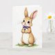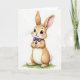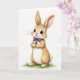 This design shows a long-eared rabbit-like character standing upright in the center of a wide white background, with a small patch of green grass beneath its feet 🐰. Its large dark eyes catch tiny highlights, and the gentle tilt of its head feels like a friendly, almost romantic invitation to come closer. Soft blush warms its cheeks, while fawn-colored fur fades into a creamy white belly under a light, airy glow. A neatly tied purple bow sits at the neck, holding a glossy deep-blue round charm that looks like a cherished keepsake. The little front paws are held together near the bow, as if guarding it with quiet affection 🐇. Near the top, a short greeting appears in light purple lettering, centered and spaced with plenty of white around it. The ear interiors are pale pink with a slightly translucent look, and the grass is painted as a thin, soft green stroke at the bottom.