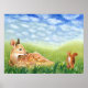 A little fawn and a squirrel. A little fawn lay in the tall, green grass. He was a red deer. He watched the clouds floating gently across the vast sky ... Picture book Illustration from a children's book 'The red deer and the hazelnuts' - written and illustrated by Julia Doria.