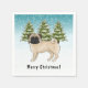 Destei's original cartoon illustration of a cute fawn coat color Pug breed dog. The dog is placed in a winter scene with three green fir trees and falling snow. The background is a blue to white gradient giving the design that cold winter day look. There is also a personalizable text area that now reads: "Merry Christmas!".