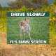 Drive slowly, it's fawn season. Be careful driving because baby deer may run into the street. A warning sign to bring caution to drivers in a wildlife area featuring a cute photograph.