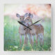 Two young fawns standing in the soft morning light surrounded by greenery.