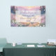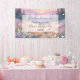 Boho and rustic Christian girl's first birthday design based on psalm 139 "Fearfully and Wonderfully Made" with a watercolor-style landscape with mountains, fir trees, wildflower meadow, and a rising sun in soft pastel colors of pink and purple.
