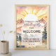 Boho and rustic Christian gender-neutral birthday design based on psalm 139 "Fearfully and Wonderfully Made" with a watercolor-style landscape with mountains, fir trees, and a rising sun.