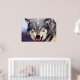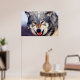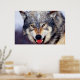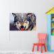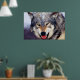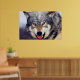This image features a close-up of a wolf's face, with its mouth open in a snarl. The wolf has a thick coat of gray fur, with darker markings around its muzzle and ears. Its eyes are a piercing yellow, and its teeth are bared, revealing sharp canines. Snowflakes are clinging to its fur, suggesting a cold, wintery environment. The overall impression is one of aggression and power.