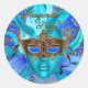 Masquerade Birthday Sticker. Mardi Gras. Masquerade Party. Elegant Teal sparkle feather mask & gold damask design.