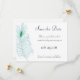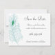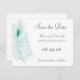 This save the date card features a single stylized peacock feather in soft blue with the eye of the feather contrasting in an emerald green. The paper is white 110lb cover weight with a matte surface. This paper contains 50% recycled content.