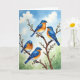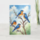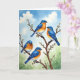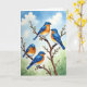 On the front of the card you’ll see four brightly feathered birds perched close together on a budding branch, their relaxed poses suggesting an easy companionship ❤️. Their backs and heads are a rich blue that warms into orange along the sides and fades to creamy white on the chest, giving each bird a soft, sunlit glow. A dark brown branch cuts diagonally across the scene, and small white flower buds cluster along it like early spring blossoms. Near the top, a short message sits centered in a simple dark tone against a pale sky, easy to spot without overpowering the artwork. The birds’ tiny dark eyes and slight head tilts create a tender, almost conversational moment, as if a pair is quietly checking in on the others. Behind them, a gentle blue sky with thin white clouds meets a misty sage-green wash that suggests distant leaves and calm air 🌼. Delicate white buds dot the branch, with a few placed near the birds’ feet and along the angled wood.