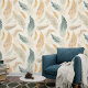This peel and stick wallpaper featuring a block print pattern of colorful feathers on a beige background appears scattered randomly across the wallpaper. This type of peel and stick wallpaper is a perfect way to add a touch of the outdoors to your home. It's easy to apply and remove. This wallpaper would look great in a bedroom, bathroom, living room, or even a kitchen. The beige background and colorful feathers make it a versatile choice that will complement a variety of décor styles.