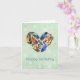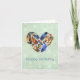 A birthday card with a watercolor design of feathers in a heart shape. Colors include yellow, orange, blue, green and brown. Some have stripes, dots, tribal patterns and other unique creative decorative arrangements. Set on a mint green vintage background with faded pink and white polka dots. Birthday message inside can be customized or personalized to suit your style.