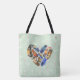 A cute all over print tote bag with a watercolor design of feathers in a heart shape. Colors include yellow, orange, blue, green and brown. Some have stripes, dots, tribal patterns and other unique creative decorative arrangements. Set on a vintage style mint green background with faded pink and white polka dots.