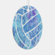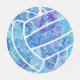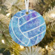 This sweet volleyball themed ornament has a blue color theme with purple & turquoise accents and features the outline image of a simple volleyball - a delicate doodle pattern of paislies, flowers and feathers in white covers all but one of the volleyball's textured-look panels - personalize with her name on the front, year on the back - by katz_d_zynes