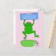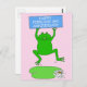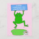 A giant cartoon frog leaping above a very big lily leaf and white flower, against a pastel pink background. The frog holds a blue rectangular sign that says Happy February 29th Birthday'.