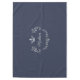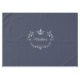 Elegant federal blue colored tablecloth with graphics of a silver tone flourish and crown text area and custom text. Personalize the text to this lovely addition to your dining table.