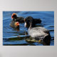 A cute little baby Eurasian Coot looks expectantly at it's parent waiting to be fed. Taken at Roath Park Lake, Cardiff, Wales.