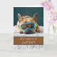 Pet-themed feel better soon paper greeting card with a dog-tired French Bulldog lying down on a shag rug and not ready to fetch quite yet. Customize the message inside the card as you like before checkout. Photograph of a cute French Bulldog with spiked collar and water goggles. Design and verse copyright © Shoaff Ballanger Studios, 2021.