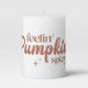 This charming fall design features the playful phrase "Feelin' Pumpkin Spicy" in a mix of elegant and script fonts. The text is arranged in a dynamic layout, with the word "Pumpkin" highlighted in a larger, flowing script that adds a sense of movement and warmth. The soft, warm brown color palette reflects the cozy and comforting vibes of autumn, reminiscent of pumpkin spice and everything nice. A couple of small star-like sparkles add a touch of whimsy and shine to the design, enhancing its festive feel.