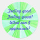 Enjoy reading and/or sharing this appreciation affirmation, "Feeling good. Feeling great! What can I appreciate?" on a geometric burst background of green and blue, printed on various products.