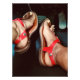 Retro 1970's red and gold hug her delicate, ebony feet.