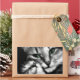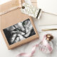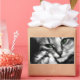 Black and white photograph of a green-eyed tabby cat cuddling an adorable little kitten.