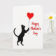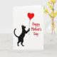 This greeting card features a mostly white background that keeps the focus on a tall, stylized black cat standing upright on the left, giving the scene a quiet, affectionate tone. The cat’s small red nose and single white eye add a gentle, friendly expression, as if it’s looking up with fond attention ❤️. One paw reaches up to hold a thin string, and the string leads to a floating red heart-shaped balloon that leans slightly above and toward the center, like a sweet offering. On the right side, the words “Happy Mother’s Day” appear in a casual, hand-drawn lettering style, set in the same red as the balloon for a unified look 🌼. The spacing leaves plenty of open room around the text, making the message easy to spot without crowding the artwork. The contrast between the black cat and the red accents creates a simple, romantic feel, like a small gesture shared between close companions. The heart balloon sits above the cat’s raised paw, with the thin string drawn straight down against the white space.