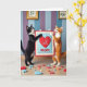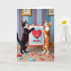 This greeting card shows two upright cats holding a fabric banner together, like close friends sharing a sweet secret ❤️. On the left stands a black-and-white cat with amber eyes tilted upward and a small, satisfied smile, while the orange-and-white cat beside it looks like it’s softly calling out with its mouth slightly open. Their paws meet at the banner’s edges, giving the scene a gentle, affectionate closeness. Centered on the banner is a large red heart on a sky-blue panel, bordered by a light patterned trim. Just below the heart sit three red letters, aligned in a neat row near the lower middle of the banner. The setting is a pale wooden floor sprinkled with tiny sculpted shapes in red, blue, and orange—some hearts, some simple geometric pieces—adding a light, celebratory feel 🌼. Behind them, the wall has vertical lavender and soft blue stripes, with two small gold-framed plant prints hanging above.