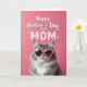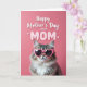 This card features a long-haired tabby cat centered in the design, looking straight ahead with a gentle, curious gaze that feels affectionate, like it’s sharing a quiet inside joke with someone special ❤️. Its fluffy face is framed by layered striped fur and long white whiskers that fan outward in neat arcs. A pair of oversized heart-shaped glasses in bright fuchsia sits on its nose, adding a sweet, flirty touch to the cat’s calm expression. The background is a uniform soft pink, creating a cozy, romantic setting without any extra scenery. At the top, a short Mother’s Day message for a step mom is placed in large decorative lettering, with small heart icons nearby for emphasis 🌼. The text appears in a darker pink tone that stands out against the pale backdrop, while leaving plenty of open space around the cat’s head. Fine details show in the fur, from the pale ruff under the chin to the darker bands along the cheeks and forehead, contrasting with the smooth flat background. The glasses have a glossy shine, and the heart-shaped frames are a saturated fuchsia against the all-pink field.