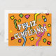 Feliz Cumpleaños Happy Birthday in Spanish for birthday ard, party fiesta celebration or greeting. Words in white on very colorful party confetti design and orange background.
